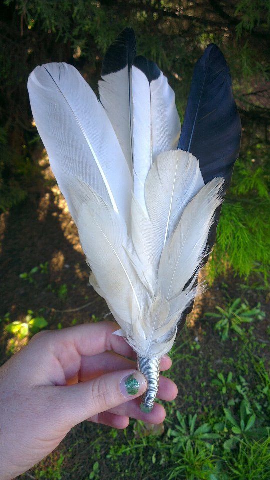 <——- My feather smudging fan. Ibis, crow and cockatoo feathers, wrapped in silver craft wire with an aventurine bead at the bottom.