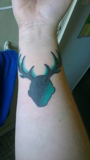 This marks my dedication to Herne the Hunter, and my final ritual in the series. This design was drawn by me, and approved of by Herne (such as six tines on the antlers, having ears, the green glow). It was done Friday night, as close to the new moon as I could get an appointment. I almost fainted (twice) during the outline, but I was fine once I asked Herne to lend me his strength to get through it.