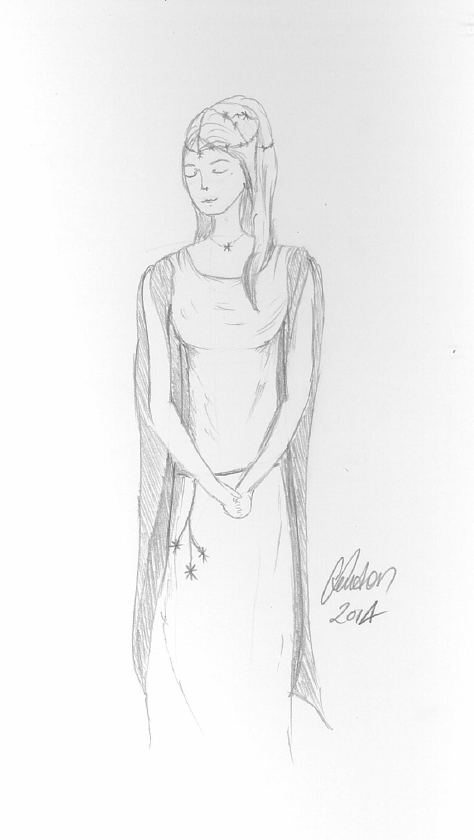 She was small framed and my height, 5’6”. She had golden blonde hair that shone in moonlight, tied back with strings of crystal and diamonds that sparkled. She wore a white and silver gown which was simply ordained with no sleeves as such, but rather organiza-like flows of cloth over her arms. More crystals hug around her small waist.