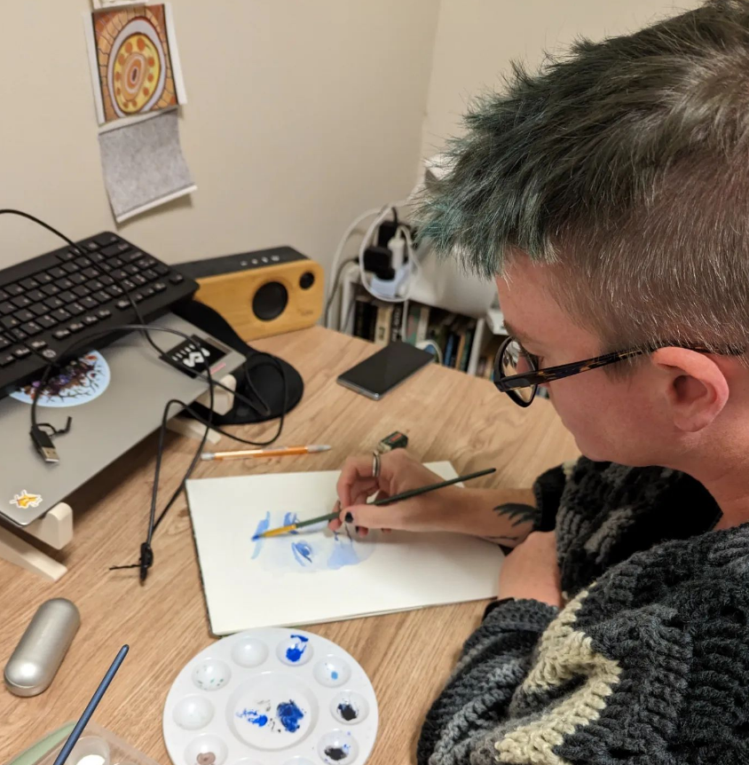 It’s something I’ve been honoured to witness, at great length, and often at weird hours of the night after being woken from deep sleep. I’ve been watching this artist come into themselves and really own her power. It’s been magnificent, to see their progression between that inner fighting of internal distrust to accepting the channel and allowing it to flow. Being on the sidelines while they find their own voice, their own magick, and pour that love and trust of self, ‘knowing thyself’ into their art; is a joy.