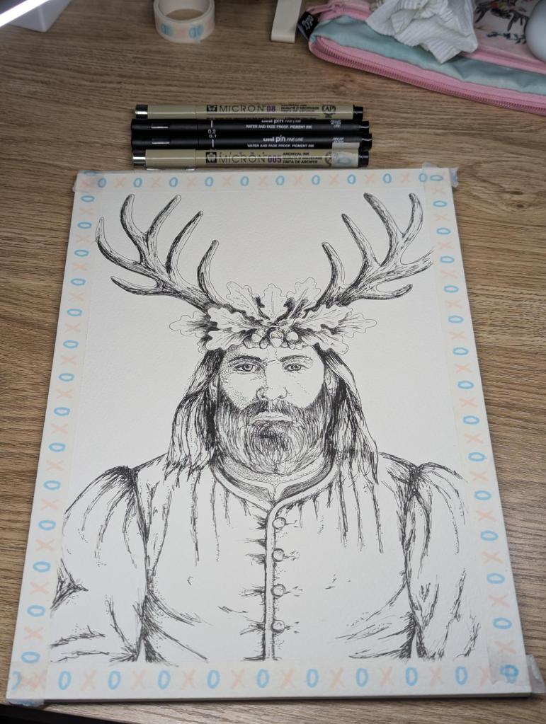 Herne as the Hunter (archetype) was my first drawing of him specifically for this book. It allowed me to reconnect with just using one medium (ie. Sakura Pigma Micron pens) and build up tone through linework and pointillism so I could have a better sense of control. I chose a round shield over a heater shield because I felt the latter felt too knightly, which Herne wasn’t and isn’t. I wanted it to feel more humble and hand-me-down which suited his rugged and solitary nature of this archetype. This is the Herne that dwelt alone in the Forest, who preferred his own company. (I’ve since added much more tone and depth since this photo was taken.)